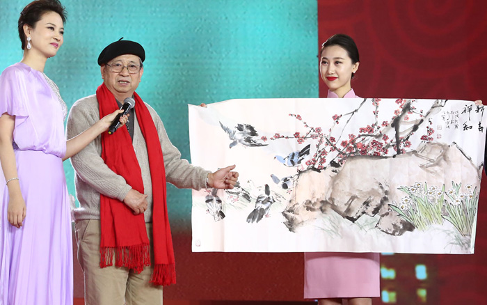 张道兴、于志学、詹庚西、谢志高、张江舟、纪连彬、梁占岩、陈平、刘建、刑少臣等十位著名画家,在晚会现场饱含深情地创作了贺岁画作,向各族人民送上了新春祝福。